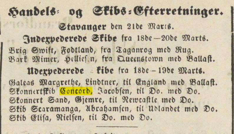 7/3-1879 Concord i Stavanger for England - avmønstret 2/4-1880 i Stavanger