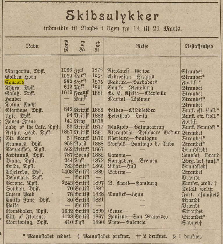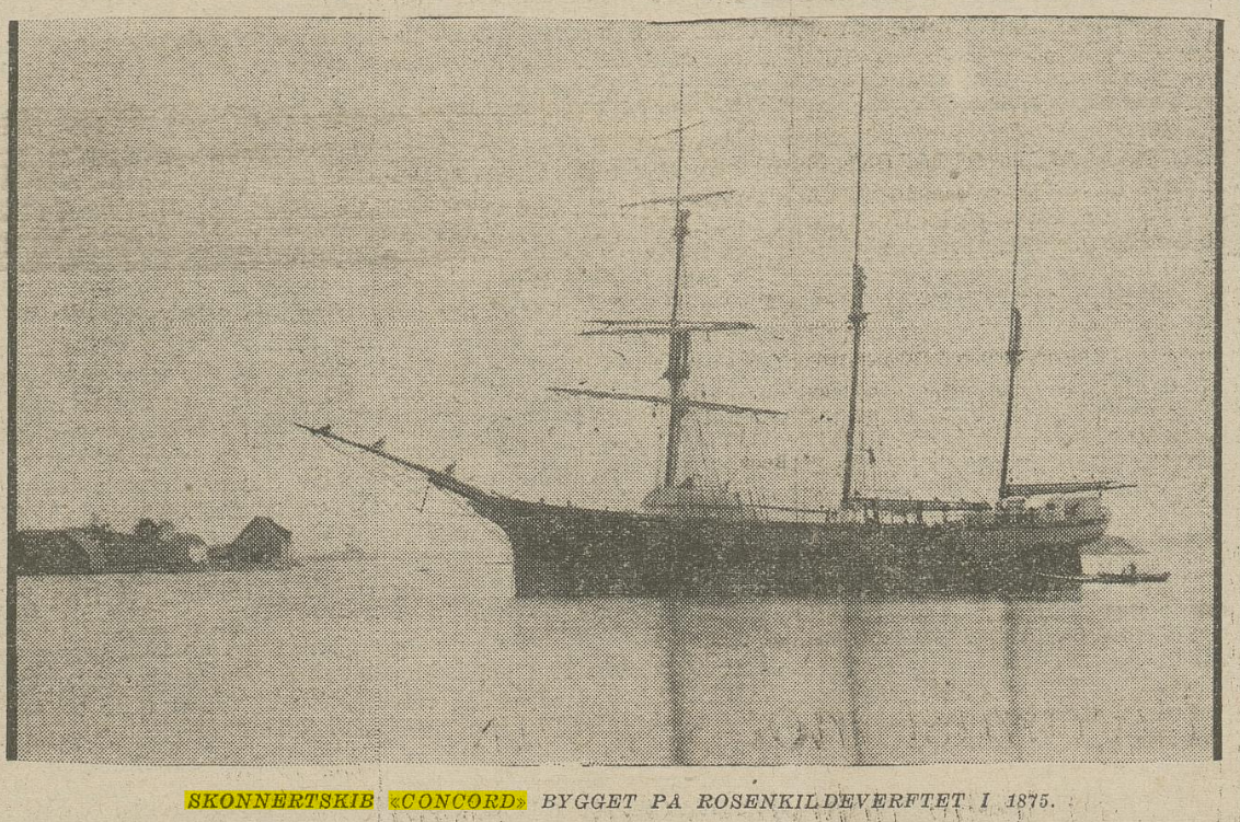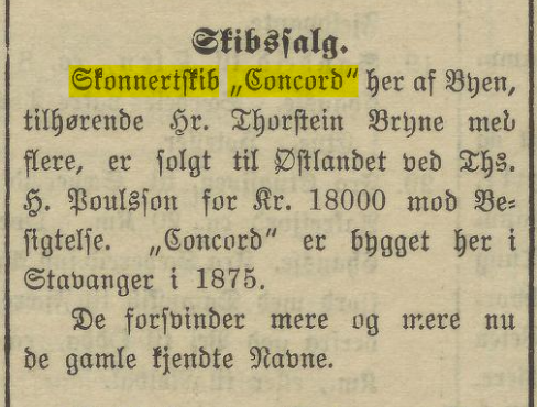 I 1895 solgtes Concord til porsgrunn, men et par år senere forliste skipet ved de vestindiske øyer og ble totalt vrag. Kilde: 1ste Mai, lørdag 9. februar 1935 - kilden under så er det nok enda senere på 1890 tallet