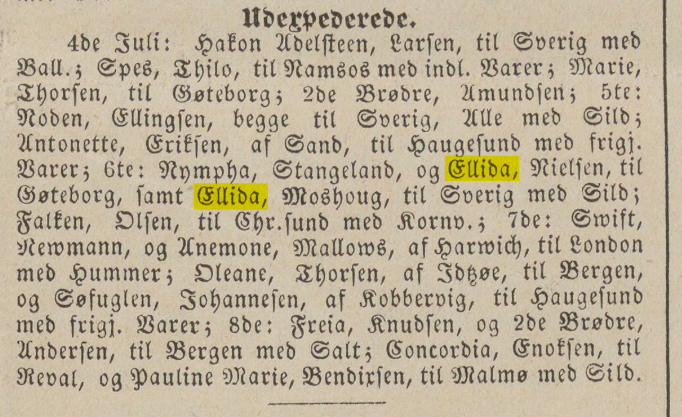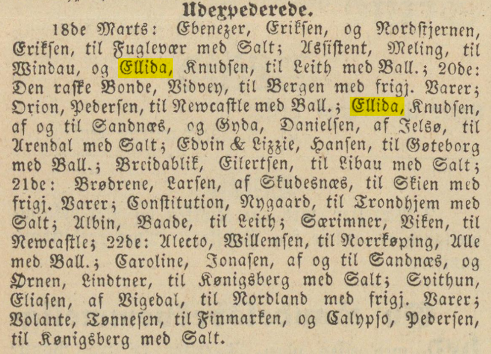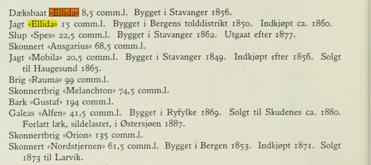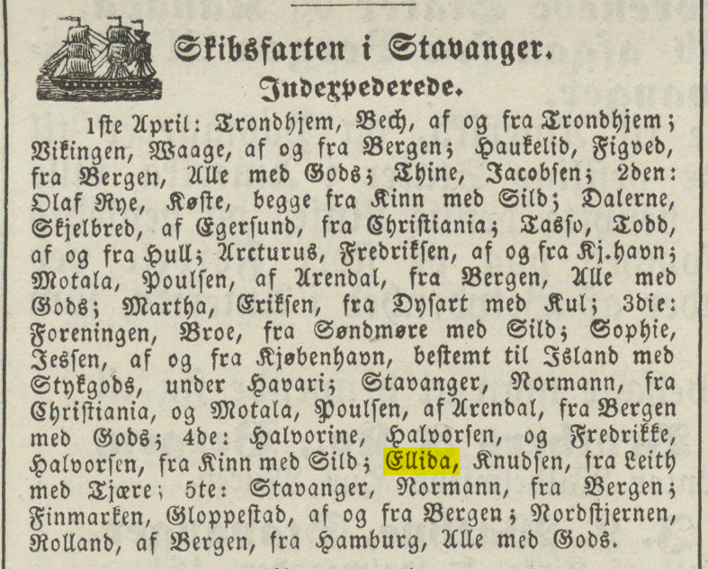 Stavanger sjømannskontor, AV/SAST-A-102006/G/Ga/L0002: Mønstringsjournal, 1870-1876, s. 55 leser jeg G. Nielsen på Ellida med drektighet 15 som da skal til England 18/3-1871. Kaptein Gabriel Knudsen.