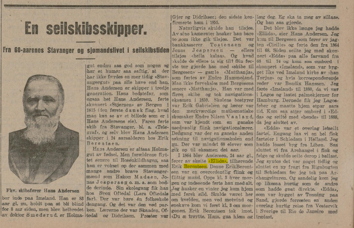 Stavangeren, tirsdag 19. september 1922 skriver om fhv. skipper Hans Andersen som også seilte på denne.