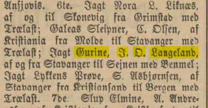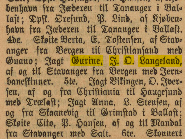 Avisklippene under viser jagt Gurine med kaptein I. O. Langeland. Kan Ivar ha hatt en jagt noen år med navnet Gurine? Kona het Gurine så naturlig å kalle opp jagten etter henne!