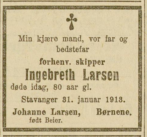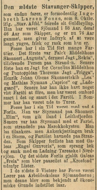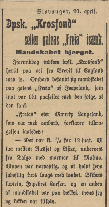 Stavanger Aftenblad, fredag 20. april 1906 skriver at dampskib Krosfond har seilet galeas Freia isænk. Videre skrives der at Freia førtes av kaptein Ingebrigt Larsen. Les mer om dette forliset under galeas Freia.