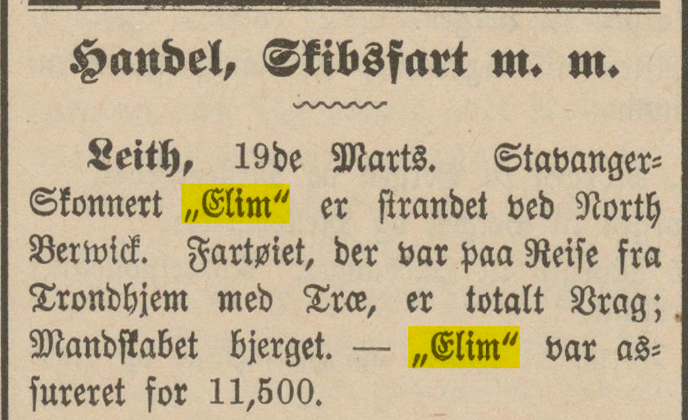 Vestlands-Posten, onsdag 21. mars 1888 skriver om skonnert Elim som er totalt vrag, mandskabet reddet.