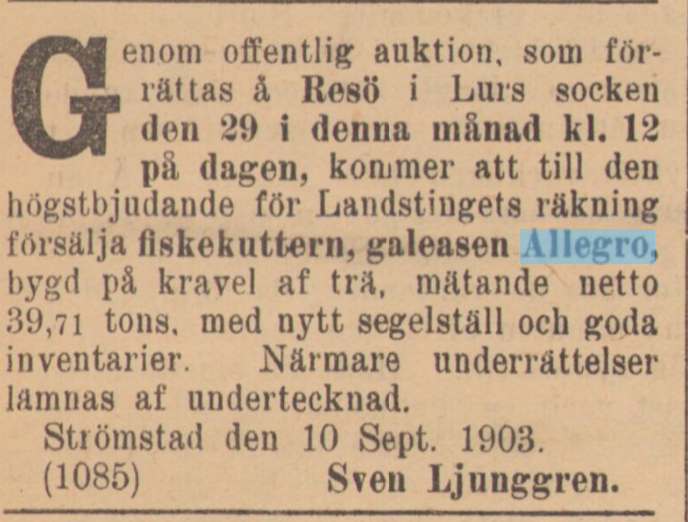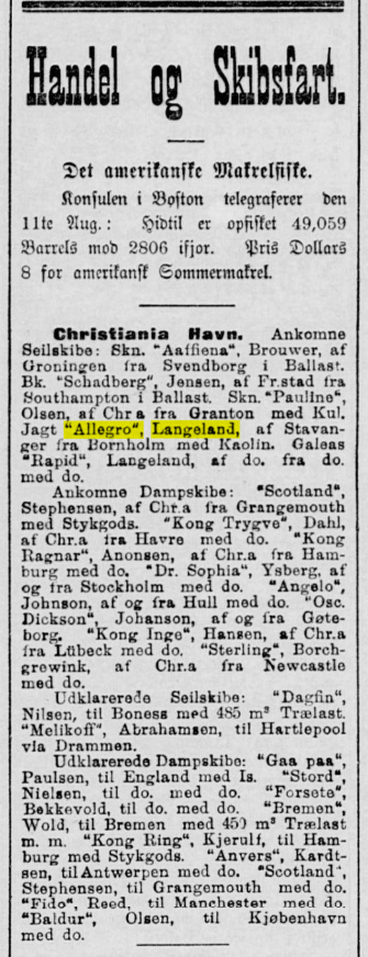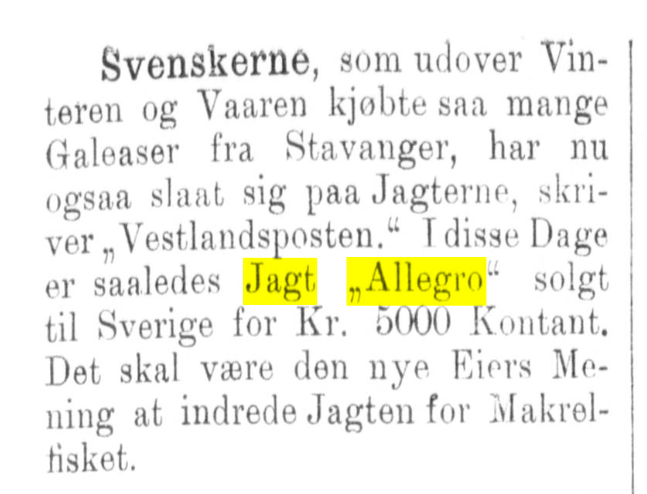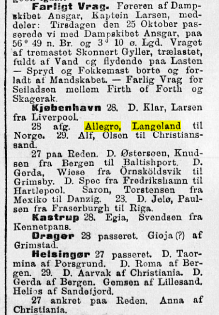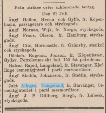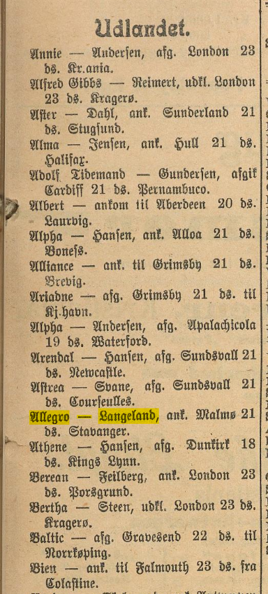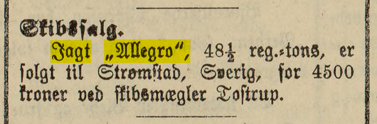 10/7-1900 Allegro i Stavanger for Malmø - Avmønstret 2/10-1900 i Stavanger