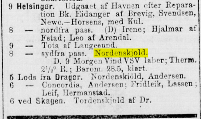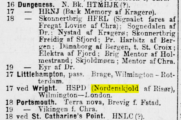 25/4-1881 Nordenskjold i Rotterdam for Wilm (Wilmington?) - avmønstret 12/11-1881 i Arendal