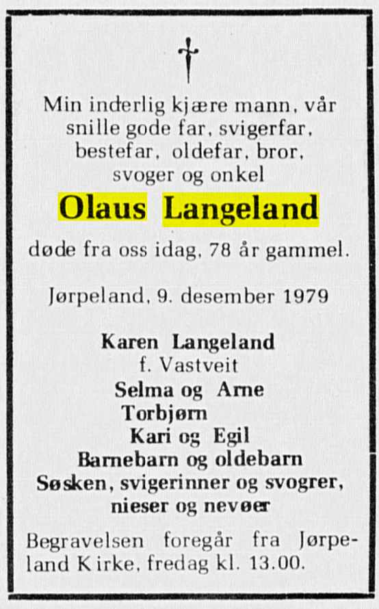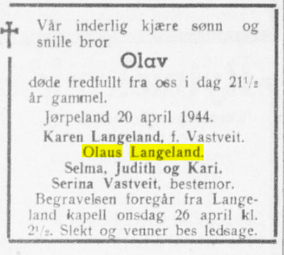 Sønnen Olav, Stavanger Avis, mandag 24. april 1944