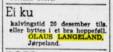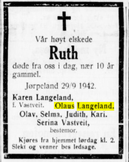 Datteren Ruth, Stavanger Aftenblad, onsdag 30. september 1942