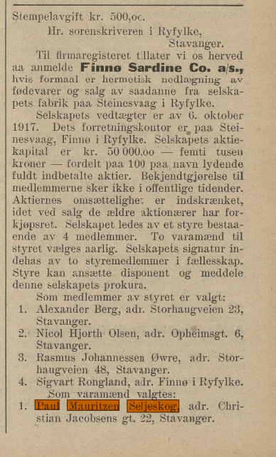 Handelsregistre for Kongeriket Norge 1917 oppgir han som styremedlem i Finnø Sardine Co