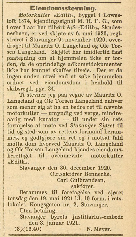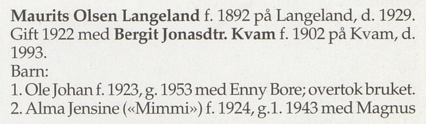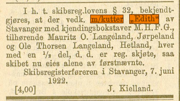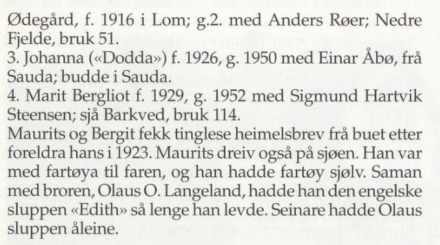 Mauritz eide sluppen med broren Olaus O. Langeland ifølge bygdeboka under.
