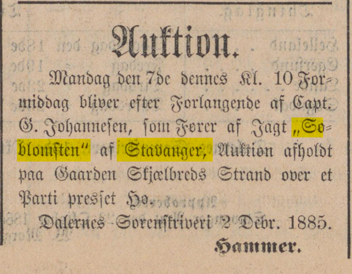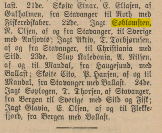 Frakteskuter og fraktemenn : trekk av fraktfartens historie skriver om jagt Søblomsten, men drektighet stemmer ikke med journalen. Dette er feil jagt.