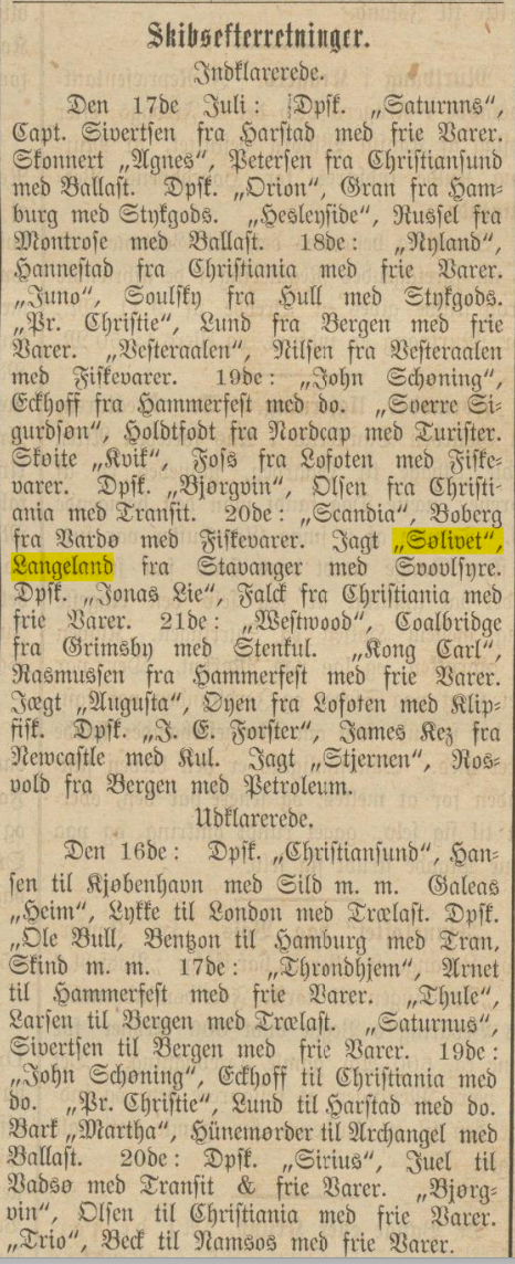 Trolig er dette Andreas Knudsen (Sunde) sin jagt . Pansatt i 1873 - kjøpt jagten, skylder Haagen Larsen Løvig 265 spd.