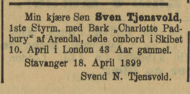 Død i London den 10de April Aar 1899 paa reise med skib Charlotte Padbury" av Arendal
