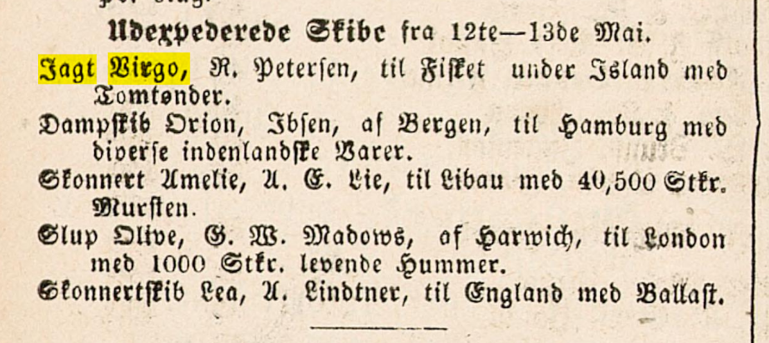 28/4-1877 Virgo i Chania til Riga - av 6/7-1877 i Stavanger